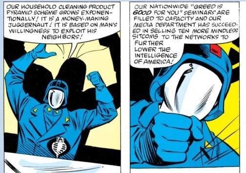 I would have thought that this would be an unnecessary thing to point out, however, I am disturbed that a number of Cobra's campaigns would cause extinction level events that would completely eliminate any possibility of corporate sustainability. Eliminating all plant life, destroying the ozone layer, cavorting with Egyptian death gods, and turning humanity into mindless reptiles are not the best way to be competitive. If you don't have consumers, there is no point being the only game in town.