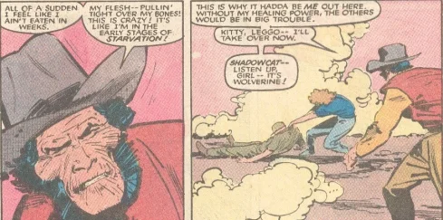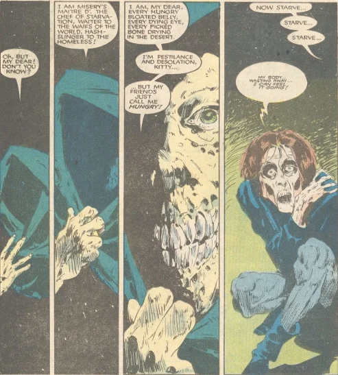 It starts making hallucinations that each X-Man experiences in order to destroy all hope they might have and make them give into despair. Particularly disturbing, are the moments written by Stephen King. In it Shadowcat is being slowly emaciated by Hunger and being taunted by food. This isn't just any kind of Stephen King prose. This is alcoholic, drugged up Stephen King at his scariest. Seeing his style being represented in a Marvel comic from the 80's is jarring as it is powerful. I only wish they let him write for them more often during that stage of his life.
