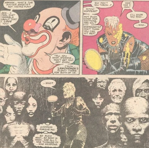 In one of the weirder moments, Storm is chased by a clown who keeps on hitting her in the face with pies. Finding herself in a circus being attended by starving Africans, she decides to stop fighting her foe in order to use his ammunition to feed the starving spectators. That sequence was written by Chris Claremont, who probably had gotten into whatever Steven King was on at the time.