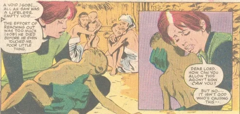 Eventually, the heroes manage to track their foe down to -- you guessed it -- Ethiopia. When they arrive they save refugees from a supply plane that has gone out of control. However, instead of running off to defeat the bad guys, the X-Men decide that their mystery villain is not important. Instead, they work for days handing out supplies to the people. They witness the atrocity first hand and watch in futility as people die of starvation right before their eyes.