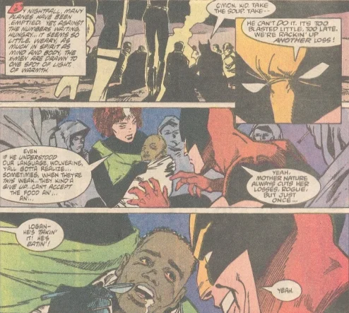 This leads to the most powerful moment of the story, where Wolverine becomes frustrated with a starving child who is so weak the child cannot even eat the food being given to him. Thinking he is witnessing the death of yet another child, he is about to give up when -- by some miracle -- the child accepts the food.