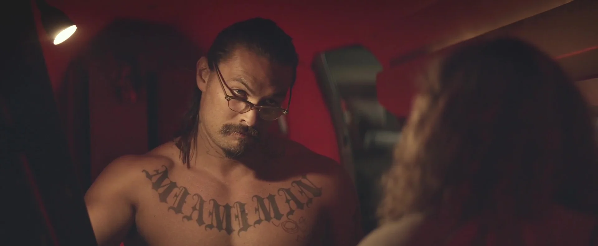 Amirpour lets a lot go unspoken in the movie which is generally to the film's favor. The dialogue tends to be on the over-indulgent side. People talk in an unnatural subtext-heavy manner that's reminiscent of Yorgos Lanthimos movies. Furthermore, the accents of our two leads are atrocious. London-born Suki Waterhouse's southern accent is about as convincing as Mick Jagger's and Jason Momoa is a Native Hawaiian doing a Cuban accent just a few ticks up the scale from Al Pacino's famous minstrel show performance from Scarface. The two do a fine job of acting but each time they open their mouths is like fingernails on a chalkboard, they should've at least found a Hispanic actor for Miami Man if not someone of actual Cuban descent and most Texans don't talk in that Tennessee good-ol'-boy drawl that's favored by films and TV anyway.